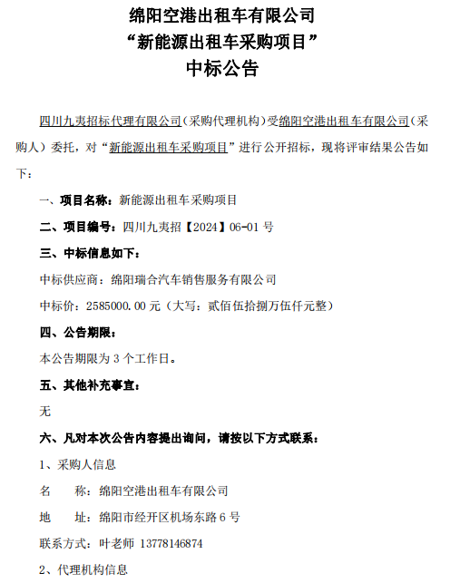 綿陽空港出租車有限公司 “新能源出租車采購項(xiàng)目” 中標(biāo)公告