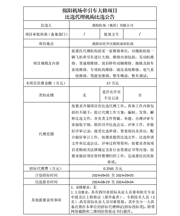 綿陽機(jī)場牽引車大修項目比選代理機(jī)構(gòu)比選公告